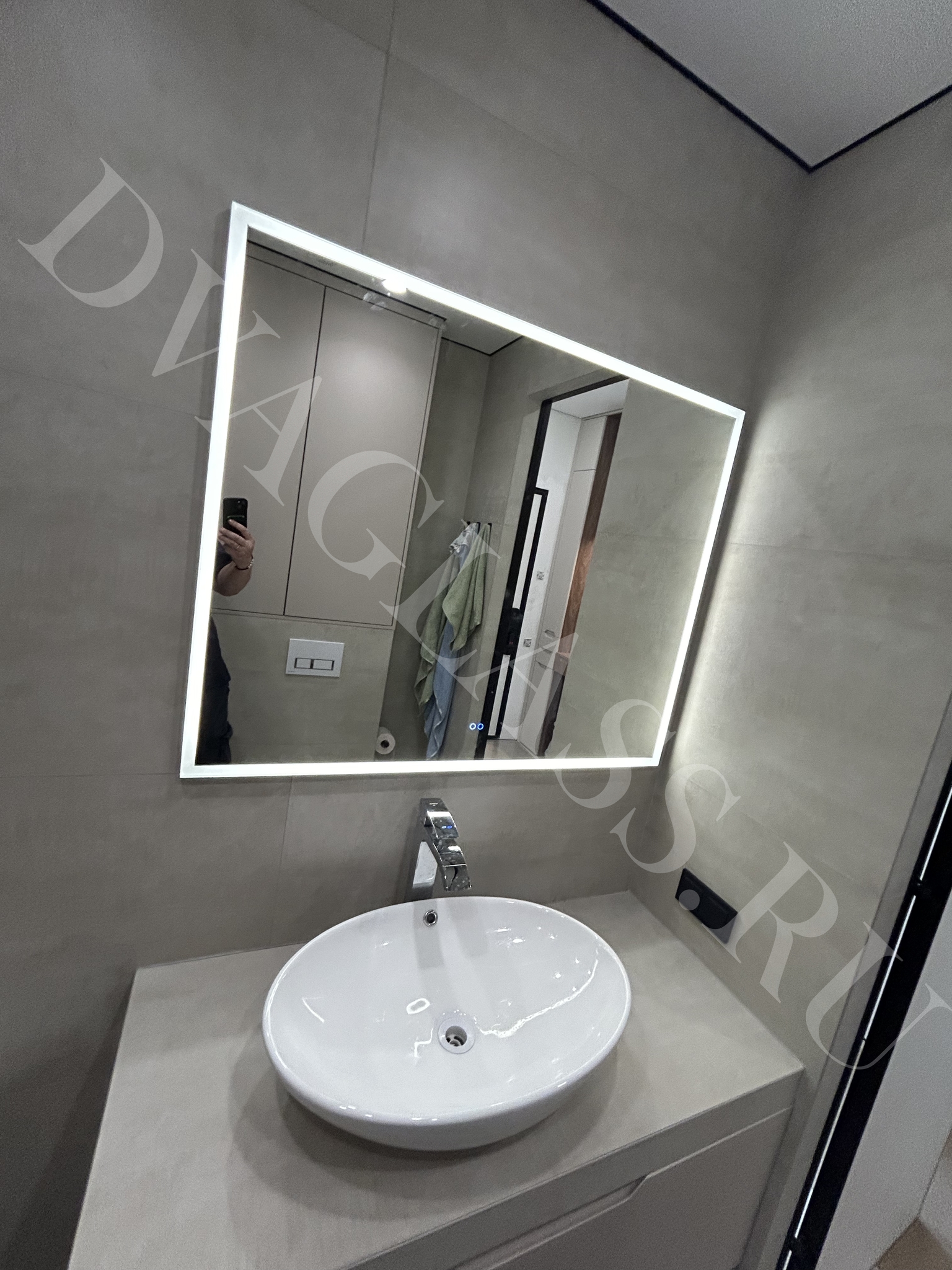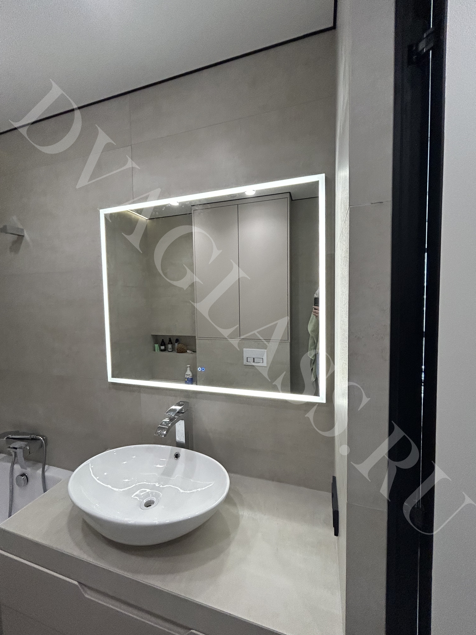 Зеркало осветленное , рама алюминий (видимая часть фронт 2мм ,торец 20мм ) с скрытыми петлями .Посветка 4000К (нейтральная), подсветка фронтальная (передняя), ширина светорой полосы 20мм, включения от сенсора Tach (кольцо на зеркале с регулятором яркости )